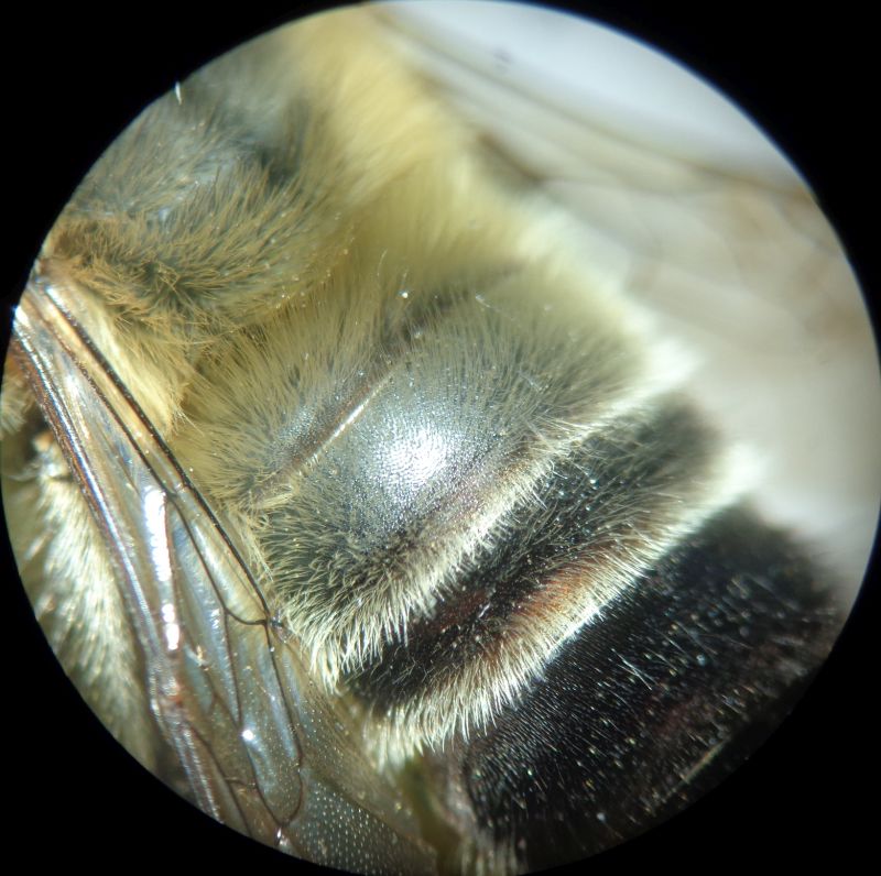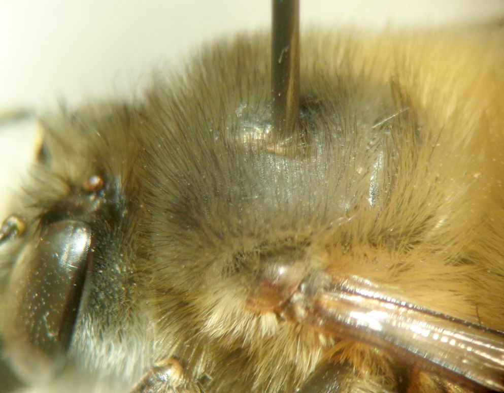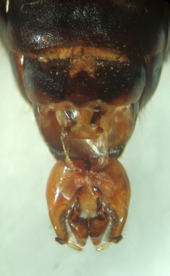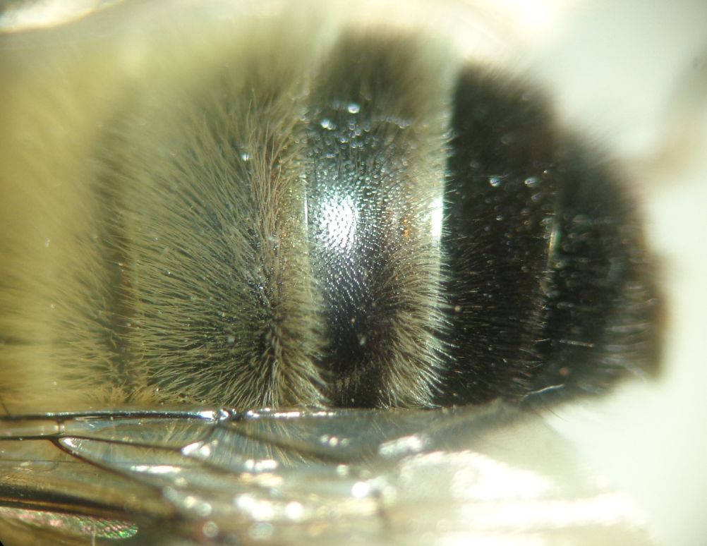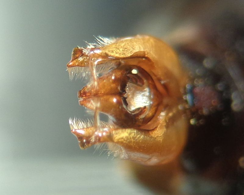 Ecco qua: l'ultimo sternite ha una spazzola basale evidente di peli eretti chiari e apicalmente due modesti rilievi con ciuffo di peli bruni; il penultimo ha una leggera carena basale ad arco che porta una serie di peli semieretti chiari. Il pigidio porta apicalmente due fossette che sottendono ad una elevazione centrale rettangolare (vedi foto).