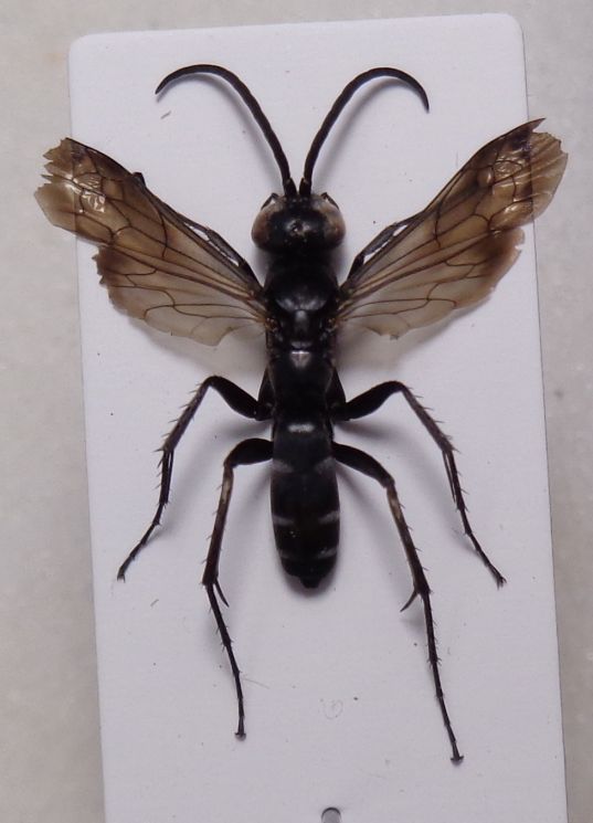 Anche in questo caso navigo nel buio: sono insetti nuovi per me corpo mm 11, maschio, non capisco nemmeno il genere esatto. I caratteri salienti sono: - testa ovunue con lunghi peli neri, occhi leggermente sinuati in alto, 3 submarginali, la mediana "parte" dall'apice del nervulus (coincide), secondo sternite senza solco, unghie tutte dentate, ali infumate con banda marginale più scura; pubescenza argentata su tibie, fronte esternamente ai toruli, angoli posteriori dello scutum, postscutello, 3 bande interrotte su terga 2, 3 e 4; pigidio nero, ipopigio non piano, carenato; due macchioline allungate alla base superiore delle tibie 3, come in maschio di Episyron arrogans (che non è ovviamente!). Ricorda vagamente Pompilus cinereus ma non lo è per me. L. Colacurcio legit Grazie per ogni parere.