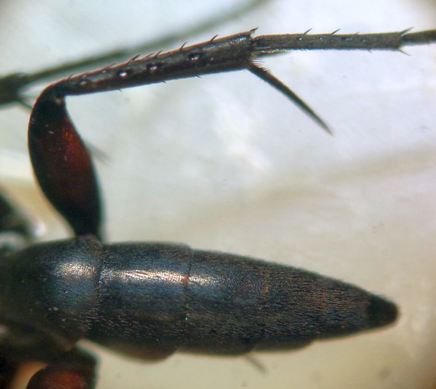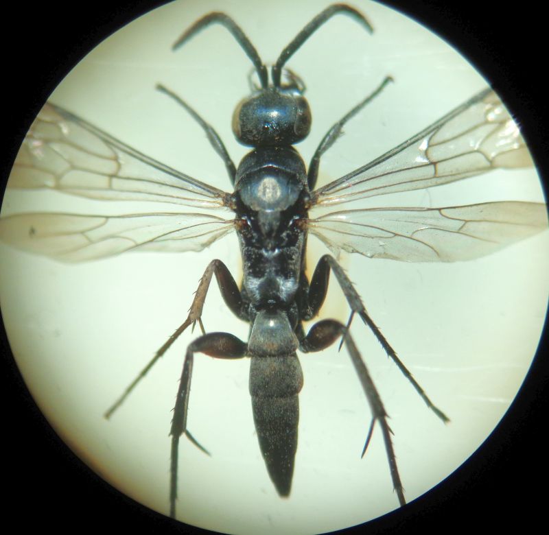 In relazione alla domanda di Andrea sulla venulazione alare di questo qui viewtopic.php?f=11&t=94051 , debbo pubblicare per conferma eventuale questo esemplare maschio di mm 7 (preso da L. Colacurcio assieme a femmine ben identificabili) che avrei determinato come in titolo e per dire che l'esemplare del link ha venulazione dell'ala posteriore identica a questo (cioè M che si stacca da M+Cu ben dopo la cu-a) ma difficilmente fotografabile causa agglutinamento parziale dei lembi, qui invece ben distesi. Chiedo quindi conferma di questo, che detto per inciso, ritengo essere diverso da quello del link, dimensioni a parte, ad es. nella forma e peluria del propodeo (qui più peloso e allungato), nelle mandibole (qui con due denti interni e uno solo nell'altro), nella forma delle orbite interne degli occhi, del clipeo, della sutura pro/mesosterno (qui angolosa) e nel diverso rapporto lunghezza mesosoma/metasoma (che qui è di poco inferiore a 1 e ben minore di 1 nel link).