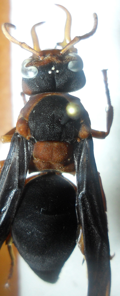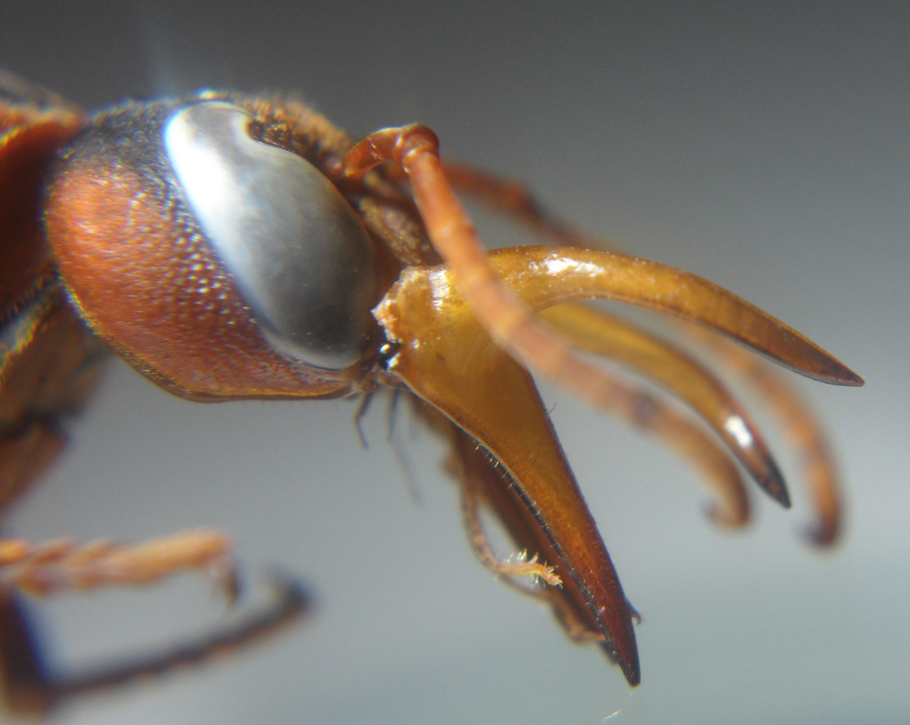 Come avevo già accennato, il maschio di questa specie presenta sulle mandibole delle corna, le cui dimensioni variano da esemplare a esemplare: in alcuni maschi, come quello che vi mostro, sono lunghe circa un quarto del resto del corpo, mentre in alcuni giganti raggiungono e superano metà della lunghezza del resto del corpo. Gli esemplari più grandi hanno inoltre il vertice e le tempie estremamente sviluppati e una breve punta a metà delle corna. Esistono anche maschi senza corna, ma sono rarissimi.