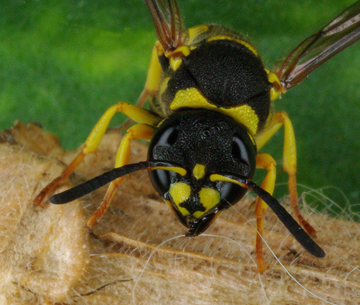 Piccola vespa fotografata a Tempio il 30.04.09. Credo che sia un Eumenidae, (o Vespidae Eumeninae, come riporta FaunaEur), forse del genere Ancistrocerus. Purtroppo le specie segnalate in Sardegna sono diverse e non so andare oltre il genere. Per fortuna era un sogetto disponibile, e l'ho potuto fotografare da varie angolazioni. A seguire foto in visione laterale, dorsale e frontale.