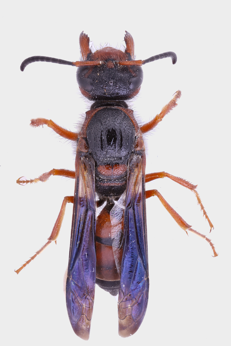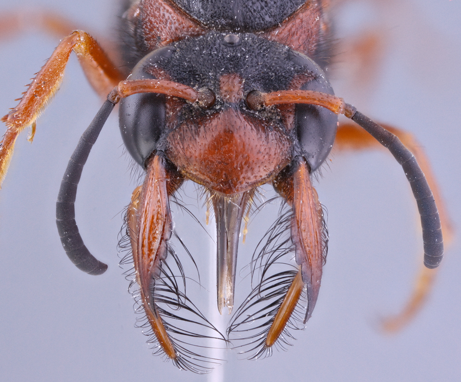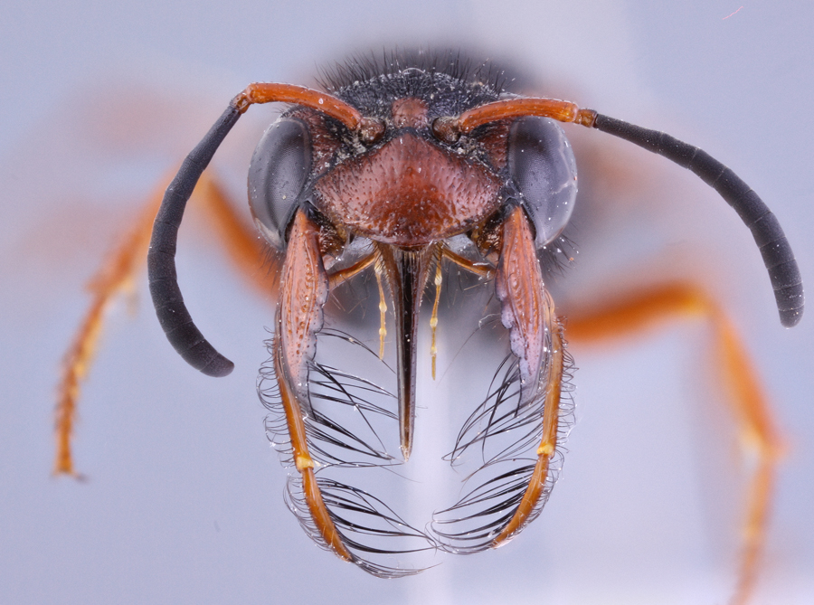 Curioso, i palpi "normali" presentano 5 articoli e questo porterebbe a Pterocheilus, ma l'ultimo articolo dei palpi "dilatati" è curvo e questo carattere è tipico di Onychopterocheilus. Ci sono anche altri caratteri che mi quadrano poco, il clipeo con il margine ventrale così dritto è da Pterocheilus (Onychopterocheilus di solito lo ha emarginato) e il mesonoto con i solchi parapsidali è da Onychopterocheilus (Pterocheilus non ha mai i solchi).