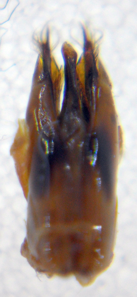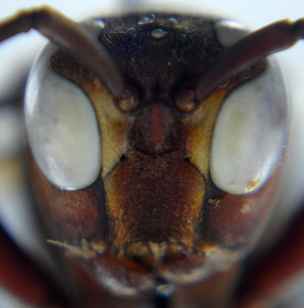 Ecco il mio primo Vespide extra-paleartico E' un maschio di Polistes tenebricosus, specie ampiamente diffusa in India, Nepal, Cina, Taiwan, Vietnam, Myanmar, Indonesia e Filippine. Inizialmente descritta come P. tenebricosa è stata rinominata P. tenebricosus in seguito al riconoscimento di Polistes come nome maschile. La colorazione più frequente è quella marrone-rossastra con alcuni segni neri sul torace, ma ci sono esemplari che presentano un rosso più acceso oppure che assomigliano incredibilmente a P. sagittarius. Questa variabilità ha portato alla descrizione di 5 sinonimi(sulcatus, hoplitus, rugifrons, varicornis e javanicus) e 3 varietà(leopoldi, nigrosericans e sibuyanensis). Come tutte le Polistes crea un nido composto da un solo piano fatto di legno e saliva. Questa specie ha la peculiarità di fare delle cellette particolarmente fonde in cui coabitano una pupa ed un uovo. 25mm La colorazione nera nella varietà più comune si trova sul lato del torace e sul propodeo Il maschio di questa specie presenta sul clipeo e sulla prima metà del lato interno degli occhi due fasce di pubescenza gialla, mentre nella femmina è monocromo(marrone,arancione o rosso in base alla varietà) Edeago |