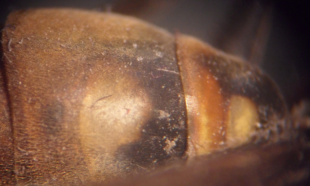 Polistes versicolor è una bella specie sud-americana che conta 3 sottospecie: flavoguttatus in Ecuador, Perù e Bolivia; kaieteurensis in Guyana e a Rorarima in Brasile; versicolor in quasi tutta l'America latina. Questo esemplare appartiene alla sottospecie nominale. 20mm Può essere riconosciuta per la combinazione dei seguenti caratteri. Mesoscuto rosso-ferrugineo Mesopleure non punteggiate o con pochi punti finissimi e quasi interamente nere Propodeo nero con due linee gialle Tergiti I-II con macchie gialle Primo tergite che si alza bruscamente, quasi perpendicolarmente, dopo il punto d'inserzione del legamento sospensorio. Purtroppo il modo in cui ho preparato l'esemplare non mi ha permesso di fotografare decentemente questo carattere. |