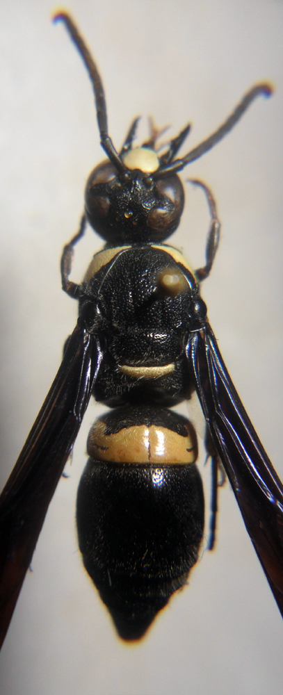Grazie alla cortesia di Gian Luca Agnoli che mi ha inviato un pacco contenente decine di Vespidi vi posso mostrare questo Eumenino, secondo me uno dei più belli in assoluto. Monobia quadridens è una specie americana presente in Canada, buona parte degli Stati Uniti e Messico settentrionale. E' inconfondibile per la colorazione nera con solo il primo tergite color avorio e per le tegule troncate posteriormente, carattere che permette di distinguerla rapidamente da altre specie con colorazione simile(Pseudodynerus quadrisectus e alcuni Euodynerus). Nidifica all'interno di cavità già esistenti come i vecchi nidi di Sceliphron e api muraiole, rami vuoti e raramente nelle gallerie sotterranee create da alcune api solitarie. Riempie le cellette con larve di Microlepidotteri di varie famiglie. 20mm |