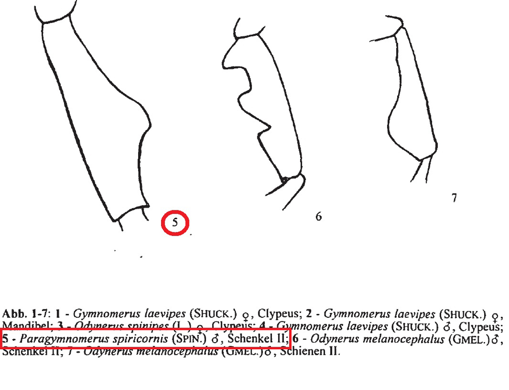 I maschi degli Odynerus e Gymnomerus hanno sul secondo paio di zampe delle escrescenze o degli incavi, l'angolazione deve permettere di vedere la forma di questi.