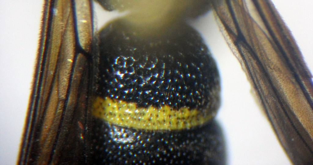 Si distingue per il prime tergite densamente punteggiato basalmente, il secondo sternite che forma uno scalino alla base, gli omeri appuntiti e una linea gialla posteriore nel mezzo del terzo tergite.