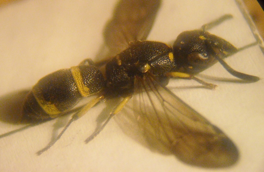 Per questo esemplare ti chiedo il contrario: sicuro che sia presente una carena sul primo tergite? A occhio mi sembra uno Stenodynerus, genere che non presenta mai la carena trasversale. Puoi controllare se la faccia anteriore del pronoto è lucida con due fossette al centro? |