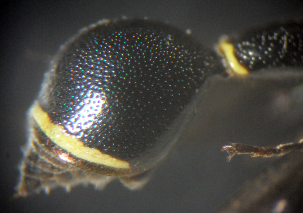 Eumenes inconspicuus è una specie orientale ampiamente diffusa dal Sud-Est Asiatico continentale fino a Papua. Si riconosce dalle altre specie per il primo tergite in visione dorsale allargato a metà della sua lunghezza ma comunque più esile rispetto agli altri Eumenes, il primo tergite in visione laterale regolarmente e fortemente curvato dorsalmente, la parte libera del clipeo lunga e fortemente emarginata e la colorazione gialla poco estesa, con la fascia pronotale divisa in tre parti. Ringrazio pubblicamente la collega Thi Phuong Lien Nguyen per l'aiuto datomi nell'identificare questo esemplare. 10mm all'apice del secondo tergite |