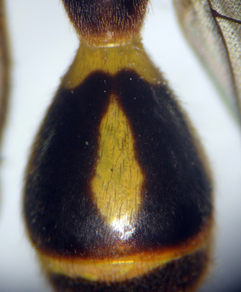 Si riconosce per il mesoscuto con punteggiatura poco profonda e con due linee gialle, il vertice ampiamente macchiato di giallo e il secondo tergite con un segno giallo mediano longitudinale.