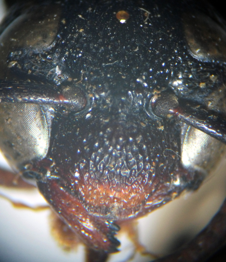 La colorazione nera con clipeo e mandibole macchiati di rosso rendono questa specie facilmente riconoscibile.