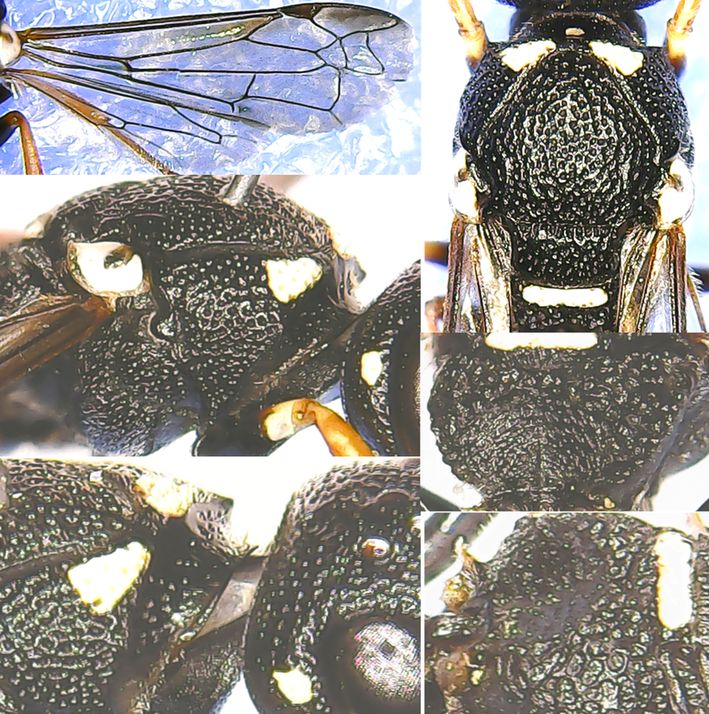 Seguendo le chiavi di Giordani Soika. non vedendo alcuna vera e propria fossetta nella parte anteriore del pronoto arrivavo al genere Eumicrodynerus ma documentandomi meglio, vedendo la distribuzione geografica e confrontando le immagini proporrei femmina di Stenodynerus bluethgeni (?). Ho catturato anche una seconda femmina uguale a questa ma con delle macchie bianche allungate alla base della mandibola e delle piccole macchie bianco-giallastre nella porzione basale-laterale del clipeo |