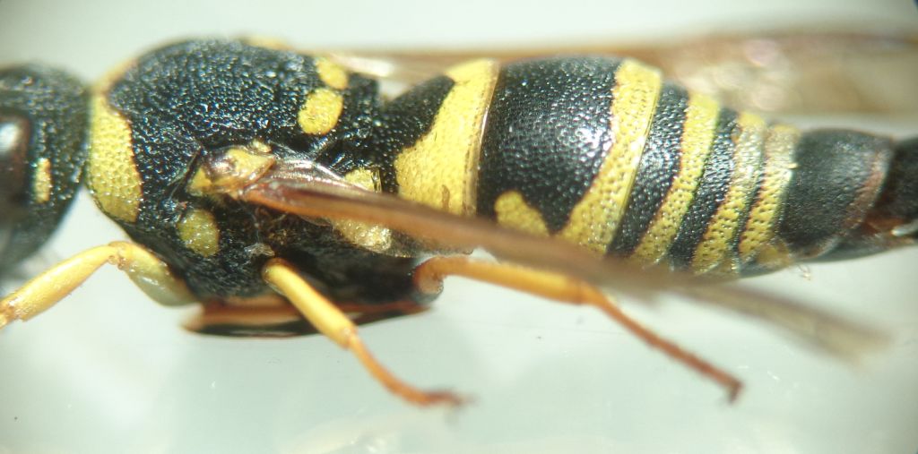 Le tegule con grossi punti non lasciano dubbi. La colorazione degli ultimi due tergiti è particolarmente variabile in quasi tutti i maschi di Eumeninae nostrani.