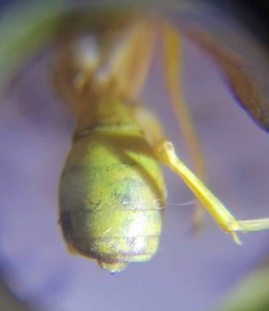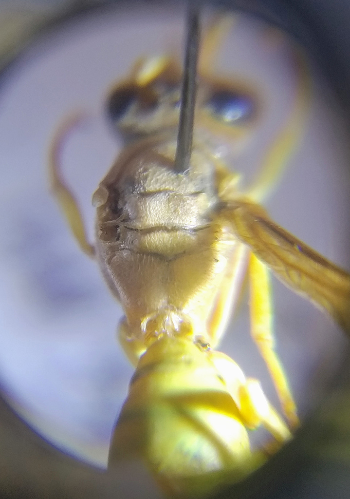Qualche giorno fa, incuriosito dalla colorazione di alcuni individui, mi sono fatto spedire gli esemplari di una colonia di Polistes gallicus marchigiana. Ho così avuto modo di vedere dal vivo alcuni esemplari dotati di una colorazione del tutto fuori dal comune, quasi completamente gialla, in contrasto con il tipico pattern a strisce gialle e nere che tutti noi siamo abituati a vedere nei Polistes nostrani.