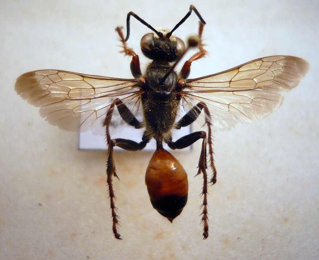 La seconda cella submarginale é quadrata, le tibie anteriori e le tegule sono rosse. A mio avviso é una piccola femmina si Sphex funerarius. |