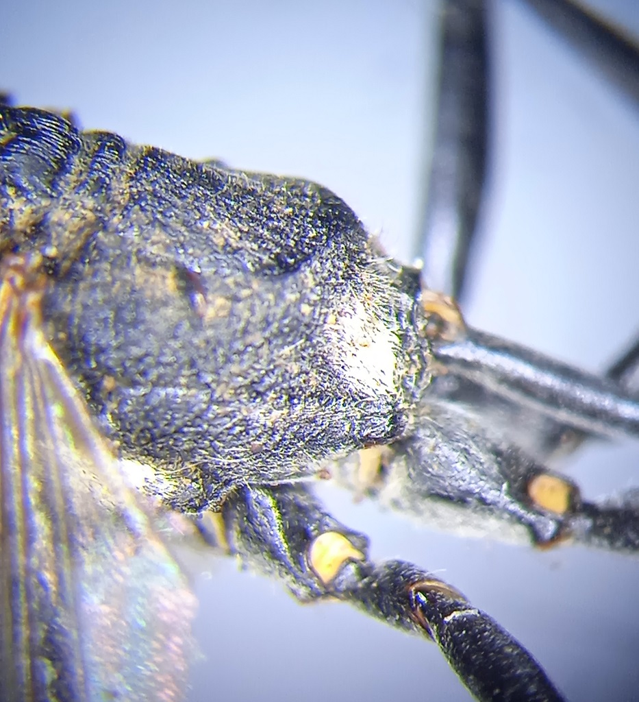 Glabra non è, i peli appaiono consunti ma presenti; il bluastro che devi cercare è nella zona nerastra apicale dell'"addome" (gastro), che non è quasi mai di un nero cupo in questa specie. Comunque il bluastro compare anche nel mesofemore della foto iniziale con vista laterale. :hi: