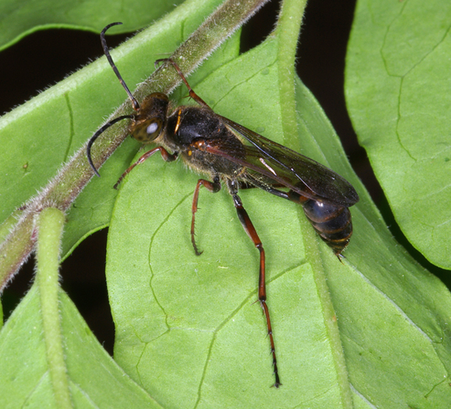 Non sono molto sicuro che sia uno Sphecidae: l'aspetto generale è quello, ma sia la colorazione dell'addome, molto inusuale, che gli occhi "leopardati", non li ho mai visti in nessuna specie.