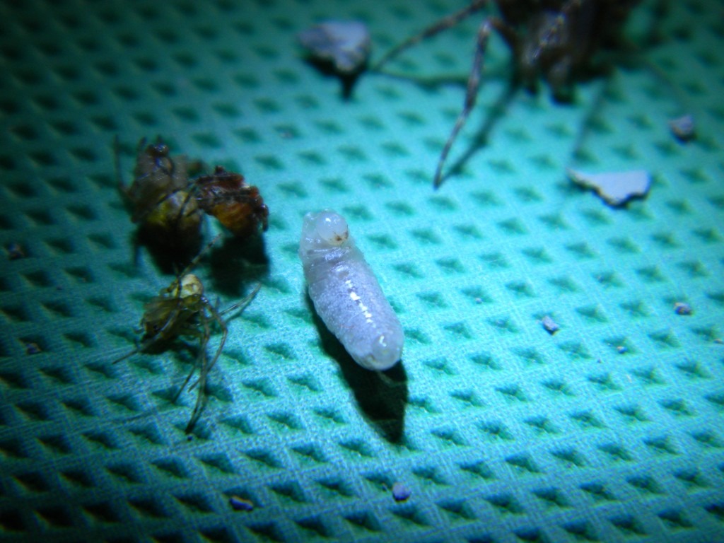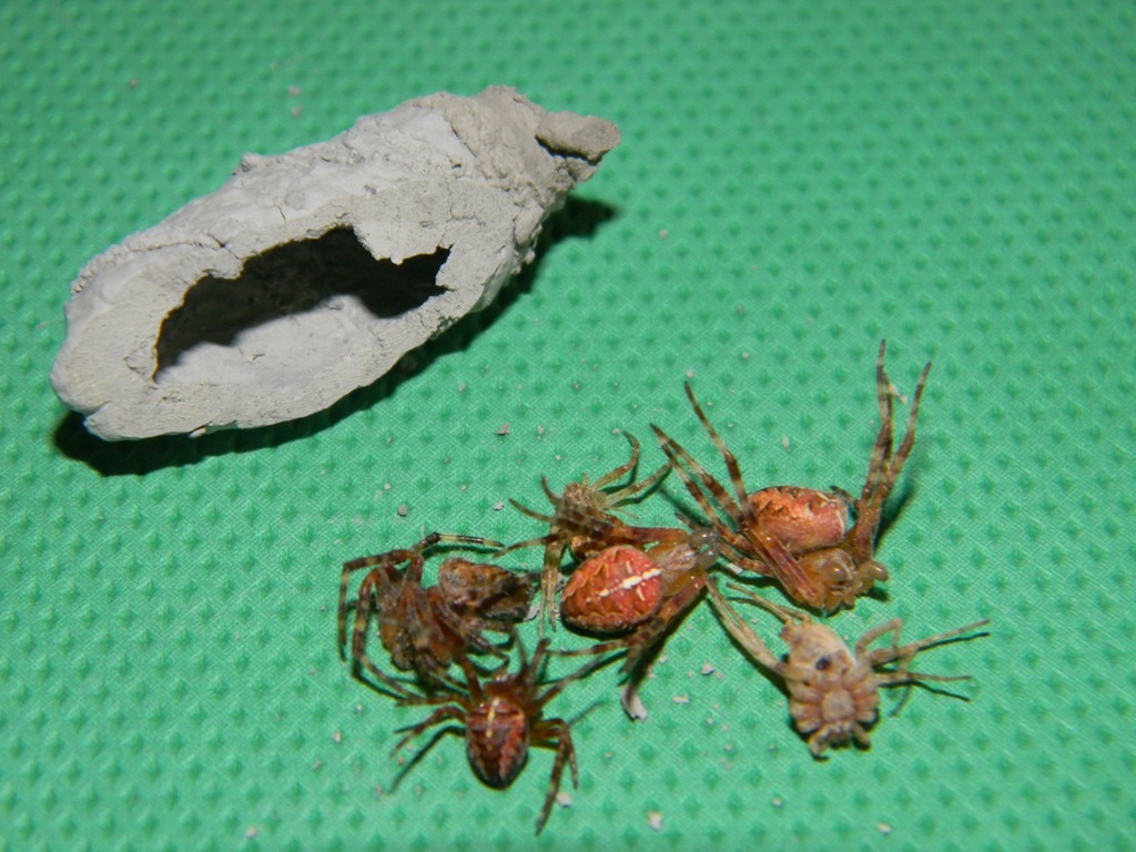 Ho osservato la costruzione dei nidi dentro l'armadio delle camera da letto, ho poi aperto uno di questi nidi per vedere cosa conteneva: molti ragni paralizzati (la maggior parte dovrebbero essere Araneus diadematus)e la larva della vespa.