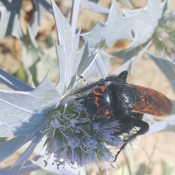 Ho trovato sulle dune (provincia di Pesaro, Adriatico) questa femmina di Megascolia con fronte di color arancio scuro, non gialla come gli esemplari osservati finora, e con un disegno diverso, molto più nero. Si tratta della stessa specie (Megascolia maculata flavifrons) o di una specie o sottospecie diversa?