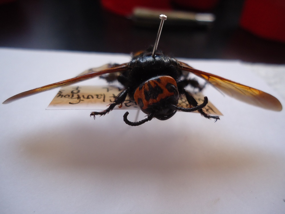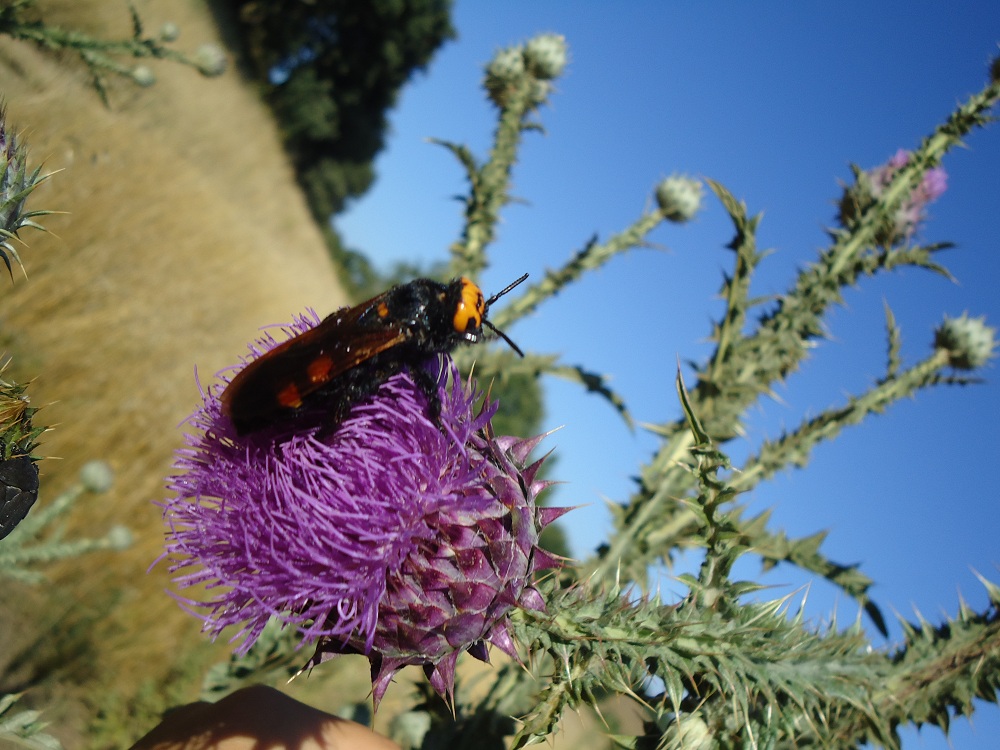 riguardando i miei esemplari di scolia mi sono accorto della variabilità del disegno giallo della testa, in alcuni era molto esteso mentre in altri lo era meno, aggiungo anche un paio di foto di una terza femmina fotografata ieri su un fiore di cardo a pomezia, Parco del sughereto
