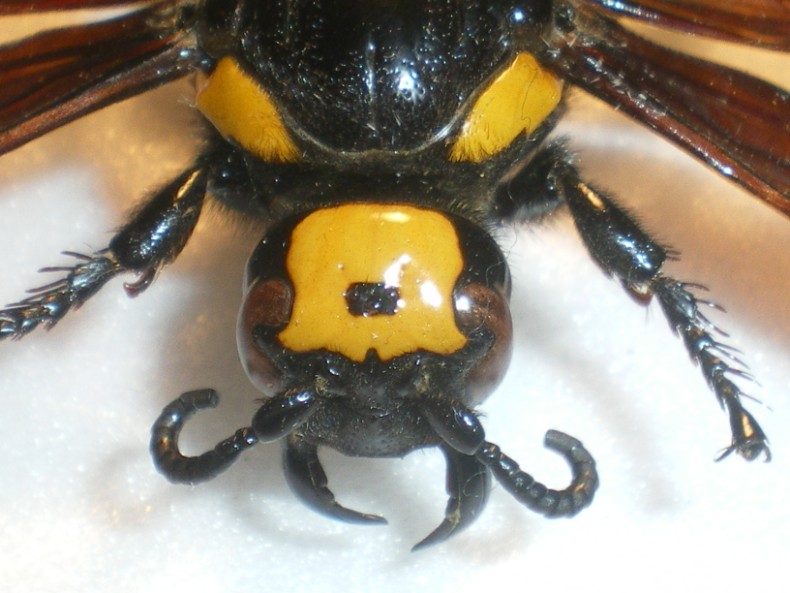 Molto particolare, le Scolia sono impressionanti 8-) Sapete se la macchia nera sulla fronte della femmina corriponde a un organo interno in particolare o ha qualche funzione? Oltre ad essere una semplice macchia, sembra infatti "scavata" sulla fronte della femmina