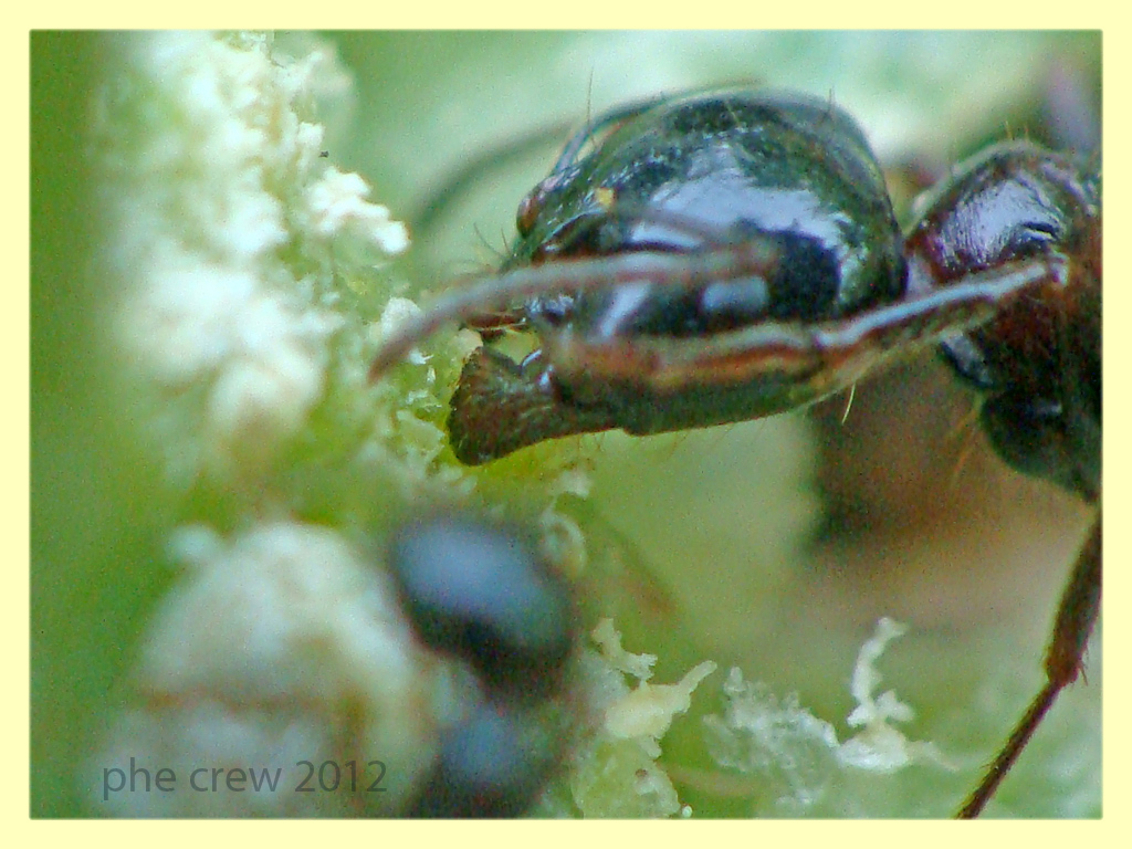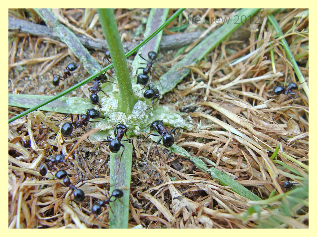 ho beccato queste formiche (credo siano delle Messor sp.) intente a prelevare pezzetti di questa pianta ricoperta da una sostanza bianca, sicuramente dal sapore zuccherino; qualcuno sa dirmi di piu' ?