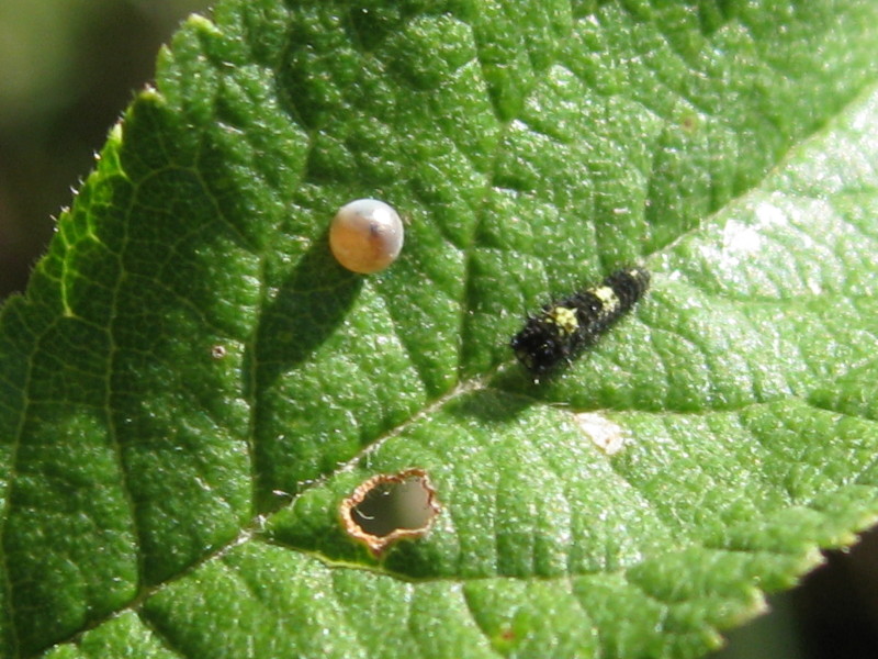 La pianta nutrice non l'ho ancora determinata (per pigrizia), comunque ci sono uova in due diversi stadi di maturazione e una larva neonata di... ???