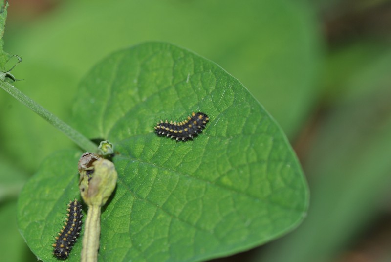 Nella foto successiva i bruchi presentano già una colorazione di fondo nera. Il bruco di destra ha appena terminato la sua prima muta ed è lungo ben 3 mm!