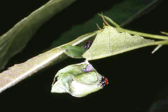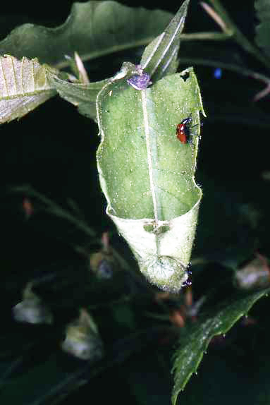 In quegli anni cominciavo anche a documentare i comportamenti dei sigarai. Senza aver presente l'articolo in questione, capitò che una delle prime popolazioni che osservai fosse proprio di Attelabus nitens, e proprio su castagno (nei quasi quarant'anni successivi mi è capitato raramente di osservarlo su tale pianta). Con i limitati mezzi che avevo a disposizione, nell'estate del 1984 fotografai, nei dintorni di Levico (TN), una coppia intenta a costruire un barilotto. Abbiate pazienza per la qualità delle immagini: sono diapositive, già non eccerzionali, scansionate dopo tanto tempo; archeologia entomologica.