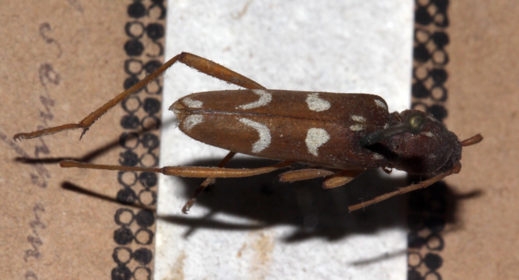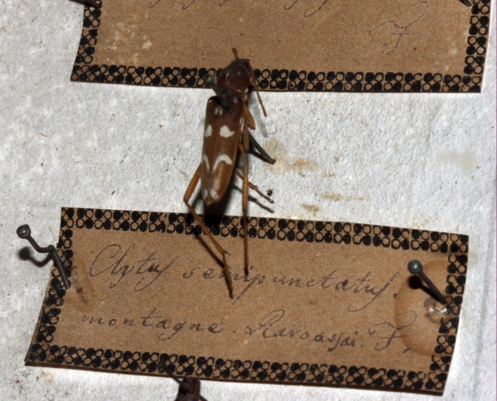 Stamattina sono stato al Seminario Vescovile di Vicenza a fare un po' di foto. Di seguito ne inserisco alcune, secondo le richieste. Ovviamente le immagini sono quello che sono, non solo per gli oltre 150 anni degli esemplari, ma anche perchè sono state scattate in condizioni certo non ottimali, attraverso il vetro del coperchio, quasi inamovibile. Comincio da quello che Disconzi nomina "Clytus semipunctatus F." e annota di suo pugno "montagna raro assai". Nel Catalogo, pag. 24 nota 1: "Questa bella specie propria della fauna subapennina [sic] fu trovata una sola volta nelle montagne di Asiago".