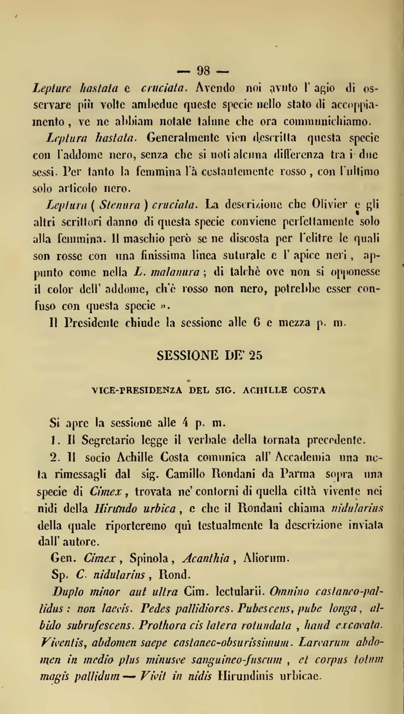 Ma la Cimex nidularius Rond.. Costa è identica a C. ciliatus Eversm. e C. hirundinis Jenyns e appartiene al genere Oeciacus Stal. (Enum. Hemipt., III, p. 103)...]