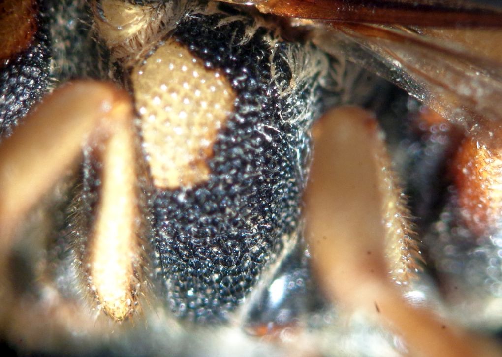 Mi orienterei sul genere Eoanthidium, ma ho difficoltà a vedere vari caratteri diagnostici. Per cominciare servirebbero delle buone foto dell'ultimo tergite, dell'ultimo sternite e della mesopleura (carena epicnemiale presente o no?). |