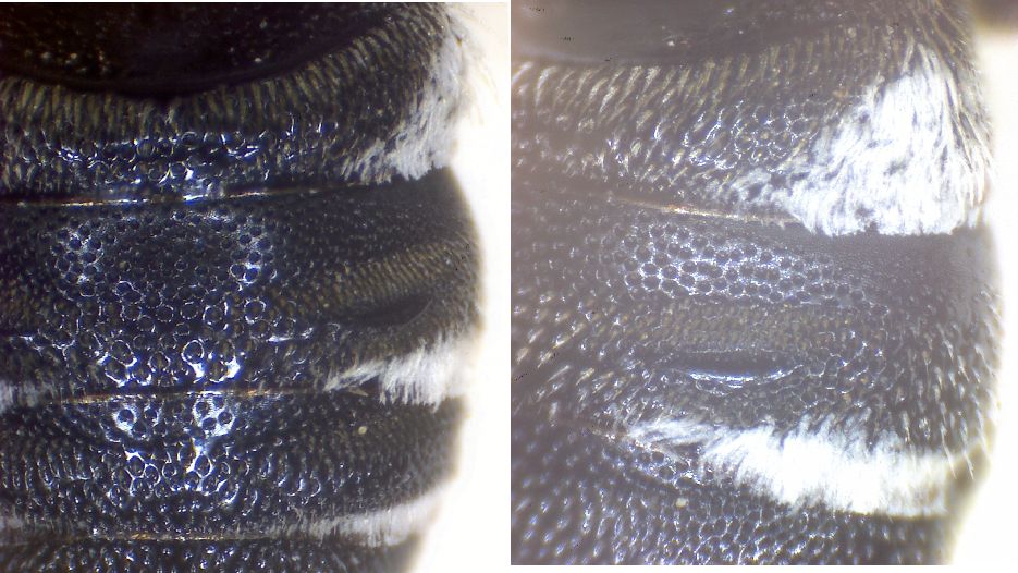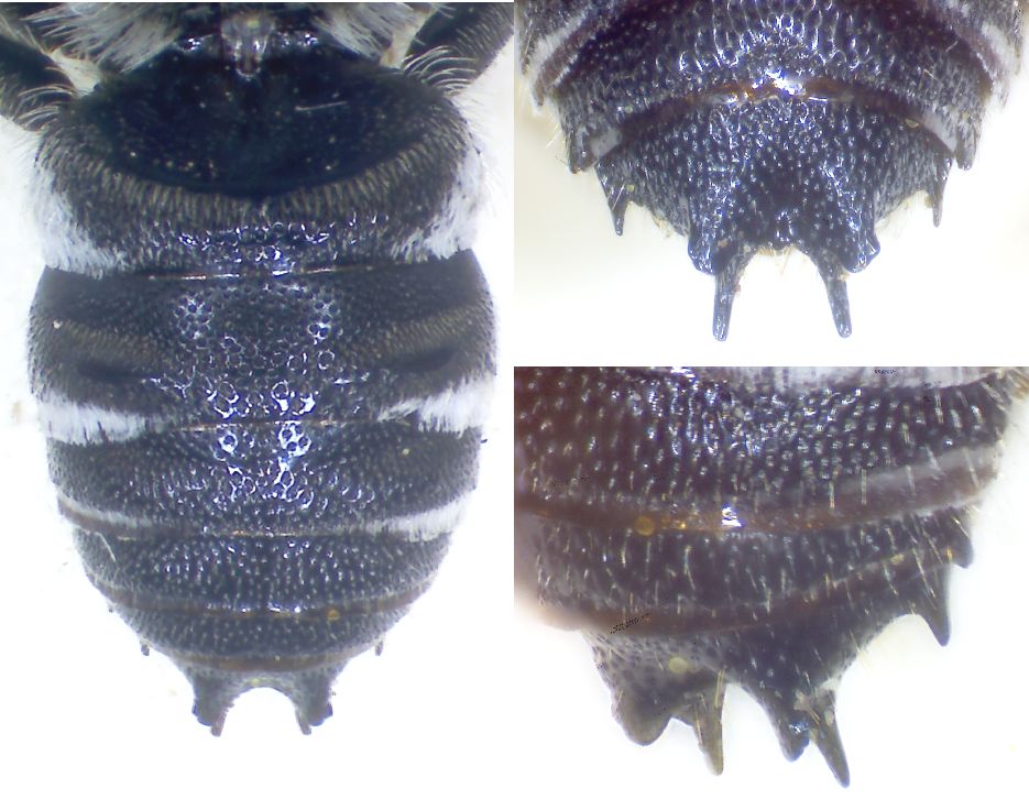 come detto da Pietro, ho potuto vedere al microscopio e con calma questi due maschi di Coelioxys. Sono molto simili tra loro e le differenze sono piuttosto sottili. Ho riorganizzato alcune delle foto di Pietro, nei due post, in una tavola comparativa con i caratteri più utili... i genitali non danno un grosso aiuto (neanche dal vero) e non li ho messi (tra l'altro, mi sembra che nelle foto siano visti uno dorsalmente l'altro ventralmente).