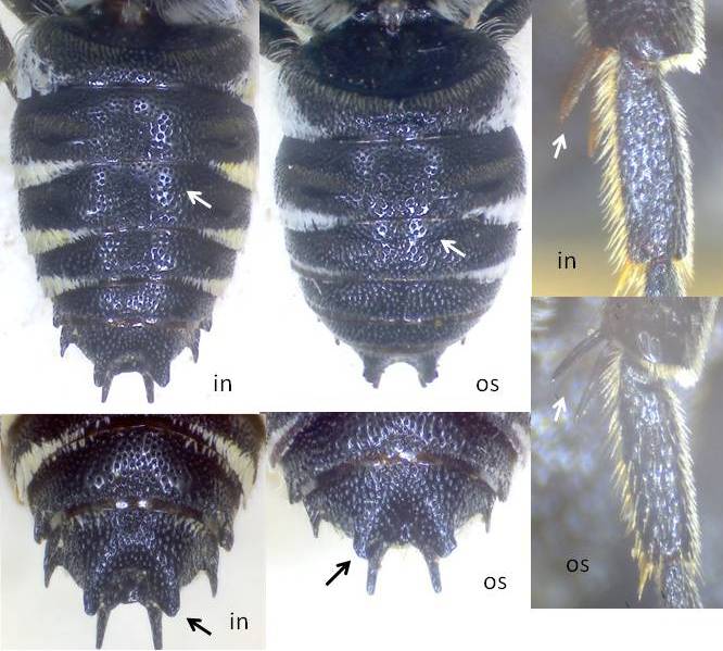 La principale differenza, quella che salta all'occhio, è la scultura dei tergiti addominali che in cf. osmiae è molto più fitta e grossolana che in inermis e non lascia spazi liberi. Gli speroni delle tibie III sono quasi neri in cf. osmiae mentre sono chiari in inermis. Ci sono anche differenze nella forma delle spine del tergite 6 e nelle fovee sul tergite 2, che in inermis hanno margini nettamente definiti mentre in cf. osmiae no (questo si vede bene al microscopio, ma non nelle foto).