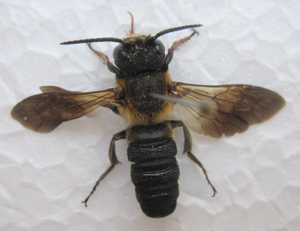Ieri 27 giugno 2014 ho trovato in pieno centro di Pavia, su fiori di glicine (Wisteria sp.), questo spettacolare (22 mm!) maschio di Megachile che corrisponde in tutto e per tutto alle descrizioni reperibili in letteratura di Megachile (Callomegachile) sculpturalis Smith, 1853, specie originaria dell'Asia orientale.