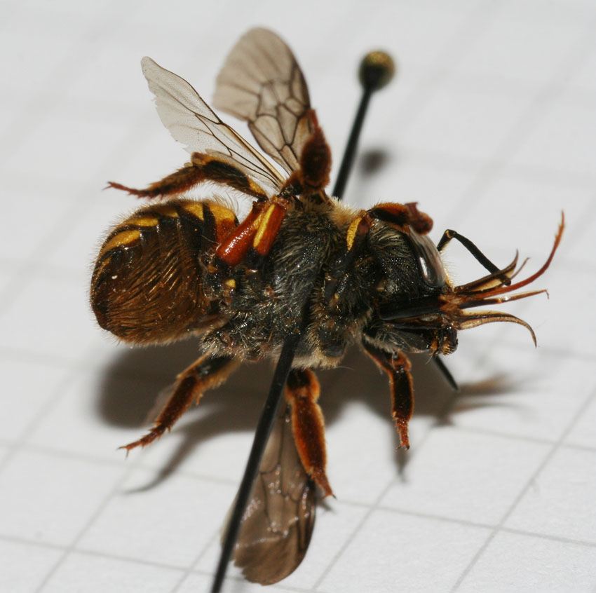 clipeo giallo con ampia macchia nera alla base estesa talora fino all'apice sotto forma di banda, tibia anteriore gialla, femori mediani e posteriori rossastri, spazzola ventrale giallastra-dorata, dimensioni 12 mm.
