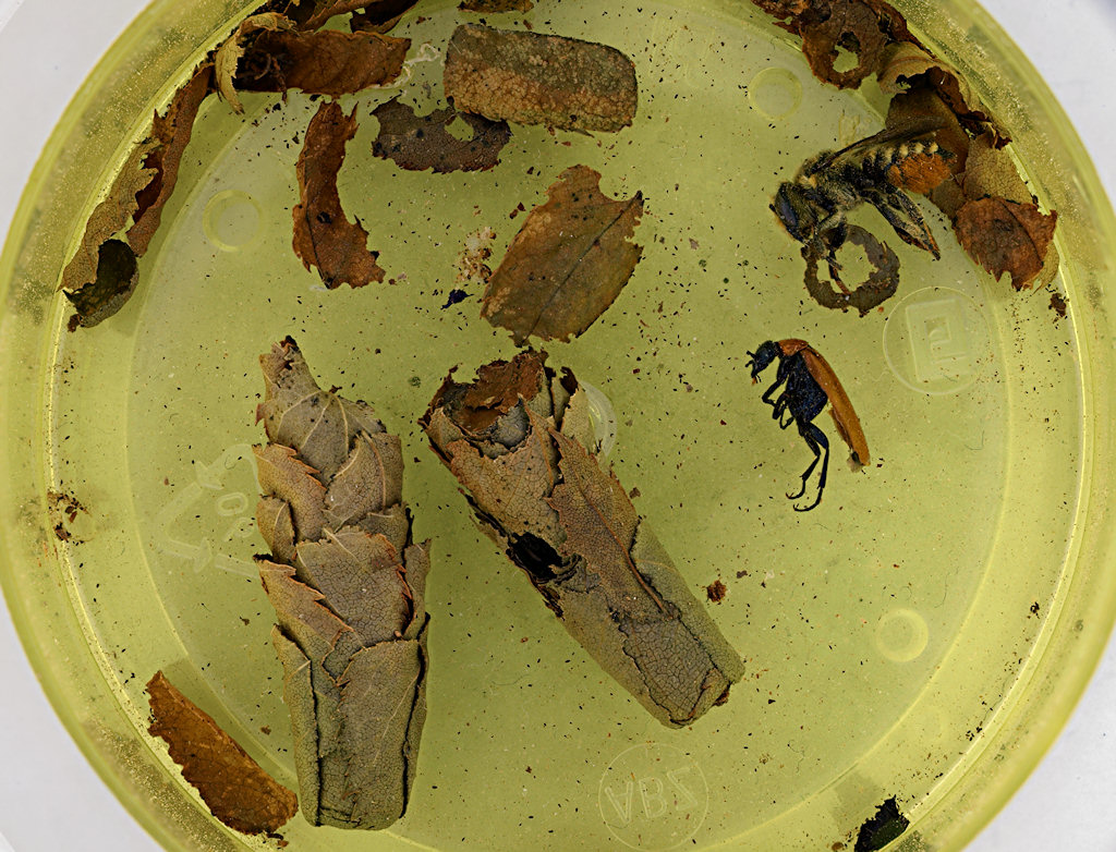 Di solito i megachile foderano di foglie una cavità; tipicamente, una canna; ci mettono in mezzo una pallina di pasta di polline e miele, l'uovo, e chiudono con altre foglie.