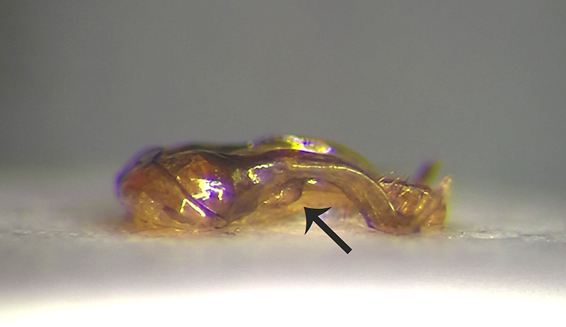 Grazie Pietro, nel frattempo ero giunto anche io a quella specie avendo trovato una foto di un esemplare così determinato, ma ora il disegno dei genitali mi mette in dubbio. La forma dei gonocoxiti si avvicina molto, ma la parte apicale ripiegata in alto nel mio esemplare sembra più sottile ed appuntita, inoltre in vista laterale c'è quella sporgenza che ho evidenziato con la freccia, che nel disegno manca.