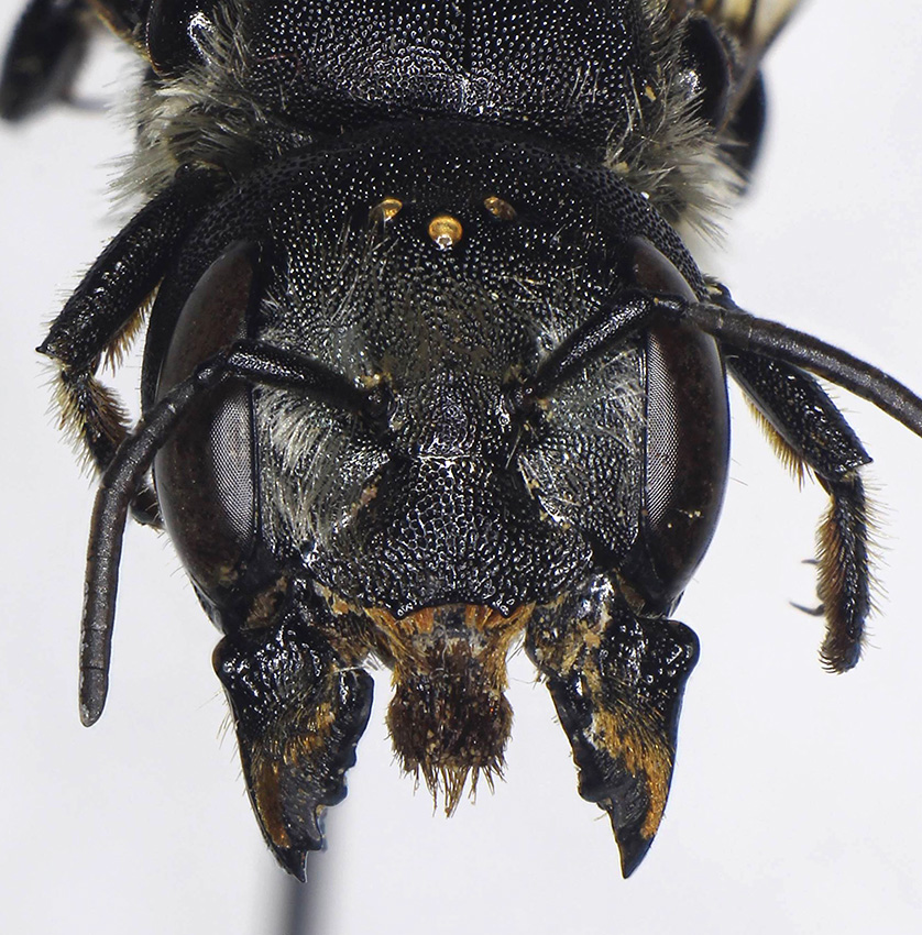Altra specie nuova per il forum. Sembra essere sporadica e con un periodo di volo abbastanza breve, io ne ho solamente tre femmine raccolte nell'arco di 10 giorni, dal 7 al 17 luglio, in tre zone del Lazio: Norchia (VT), Santa Severa (RM) e Maccarese (RM). La testa di dimensioni notevoli, il clipeo emarginato e le grosse mandibole con due robuste punte la rendono inconfondibile nella nostra fauna. 12,5mm |