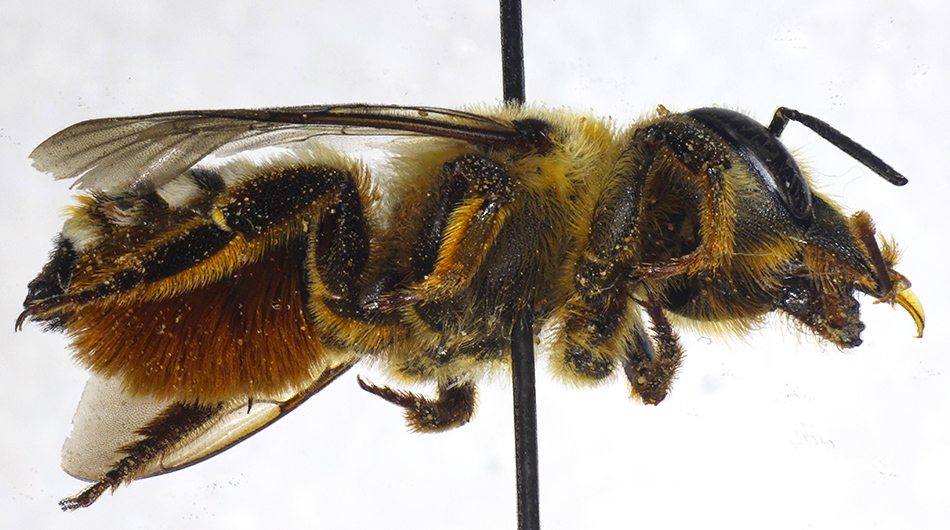 Femmina, riconoscibile per il vertice molto lungo, le mandibole con 5-6 denti, le fasce di peli dei tergiti molto larghe ai lati e la scopa interamente rossa, 13mm