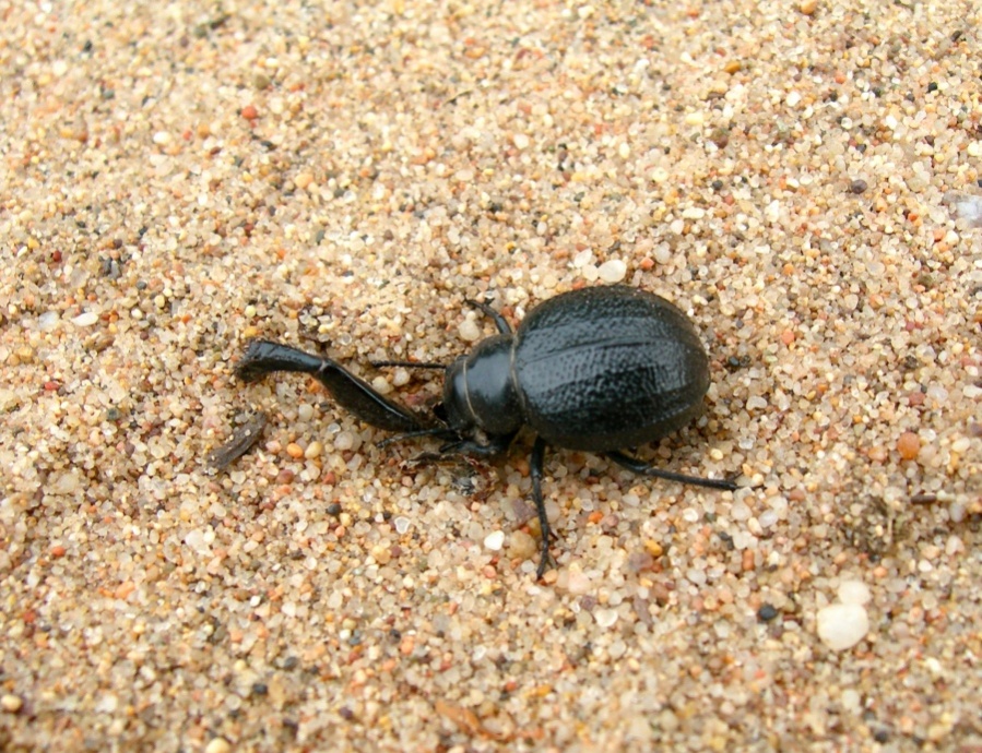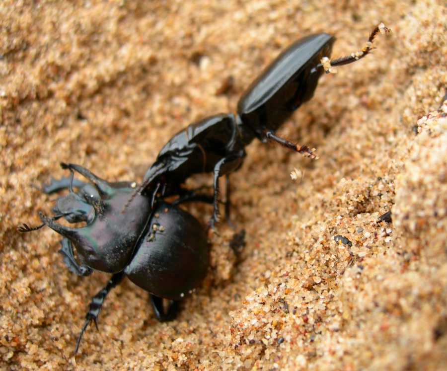 Ciao a tutti. Non so se questa sia la sezione del forum più adatta per presentare questo argomento, comunque… Due giorni fa ho fatto un giro tra Marina di Arbus e la foce del Rio Piscinas (Sardegna sud-occidentale, provincia del Medio Campidano). Girando tra le dune sabbiose ma già in parte consolidate, che si estendono nell’entroterra per diverse centinaia di metri mi sono imbattuto in una scena alquanto terrificante: il combattimento all’ultimo sangue tra due grossi e splendidi coleotteri. I protagonisti sono il Carabide Scarites (Scallophorites) buparius (Förster, 1771) e il Geotrupidae Chelotrupes hiostius (Gené, 1836). Il primo è un grande e possente cacciatore, il secondo un massiccio ma pacifico stercorario. La scena mi ha fatto pensare ad un combattimento tra un tirannosauro e un triceratopo. L’incontro è probabilmente fortuito: lo Scarites vede il Chelotrupes solo quando gli passa a breve distanza Da questo momento la sorte del Chelotrupes è praticamente segnata: lo Scarites, molto più rapido, lo ghermisce con le robustissime mandibole, cercando un punto debole nell’armatura della sua preda
