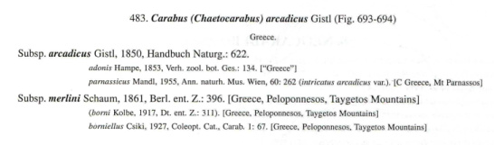 should conversely merlini be treated as a separate species, the former would become simply Carabus (Chaetocarabus) arcadicus Gistel, 1850, being in this case a monotypic species having no subspecies
