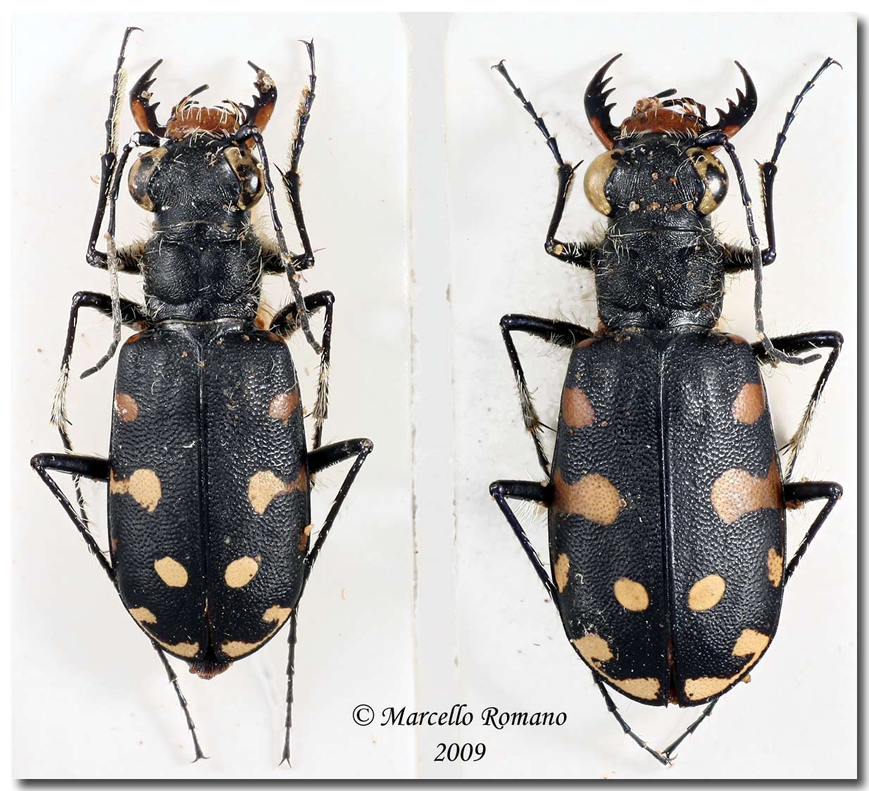 Per concludere questa interessante discussione sulla Calomera lunulata vi propongo un'ultima immagine, che mostra due esemplari, raccolti sempre in Tunisia, ma questa volta lungo le rive di un lago salato (chot o chott ?). Fanno parte di una piccola serie lasciata, purtroppo, troppo a lungo nel boccettino con l'etere, che iscurì irreversibilmente le macchie bianche elitrali Si tratta a mio avviso, in questo caso, della Calomera lunulata, sia per la scultura elitrale, che per l'ambiente dove era presente (ricordo, numerosissima). Ho fotografato insieme due esemplari che mostrano come la macchia mediana, nel punto di fusione con la marginale, sia larga nell'esemplare di destra, ma molto ristretta in quella di sinistra (come avviene nella Calomera littoralis ittoralis). Che ne pensate? cliccare per ingrandireDimensioni degli esemplari: 15 e 16 mm. Località di raccolta: Tunisia, Isole Kerkennah, 18.V.1982 L'isola che si vede a metà strada fra le Kerkennah e Pantelleria, è proprio Lampedusa (ITALIA  ) (ex stazione della specie  )