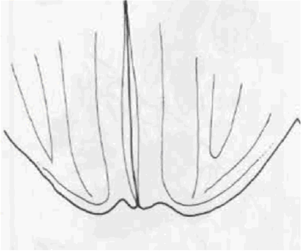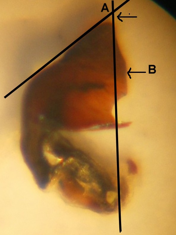 Questa foto di Giacomo l'ho modificata tracciando due righe, che fanno vedere A l'angolo apicale del paramero molto piccolo (nel nigrita è 3-4 volte più ampio) e B la porzione laterale sempre del paramero che fuoriesce dalla linea ( nel nigrita al massimo arriva a toccare la riga)