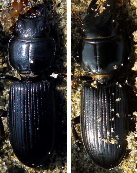 Mi sono permesso di ritagliare, rapportare alle stesse dimensioni (considerando il pronoto) e avvicinare la prima (a sinistra) e la quarta foto, al fine di comparare nei due esemplari le proporzioni tra lunghezza del pronoto e lunghezza delle elitre, ma soprattutto tra lunghezza e larghezza delle elitre.