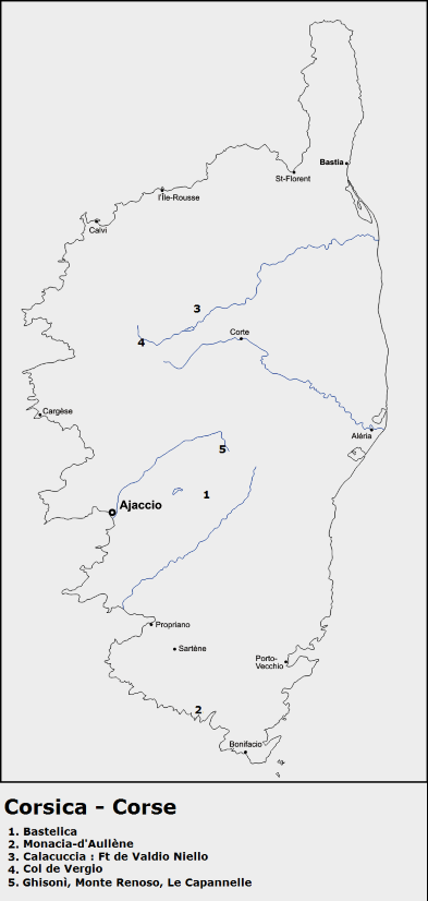 molte località in Sardegna e Corsica (secondo la letteratura e il mio materiale)