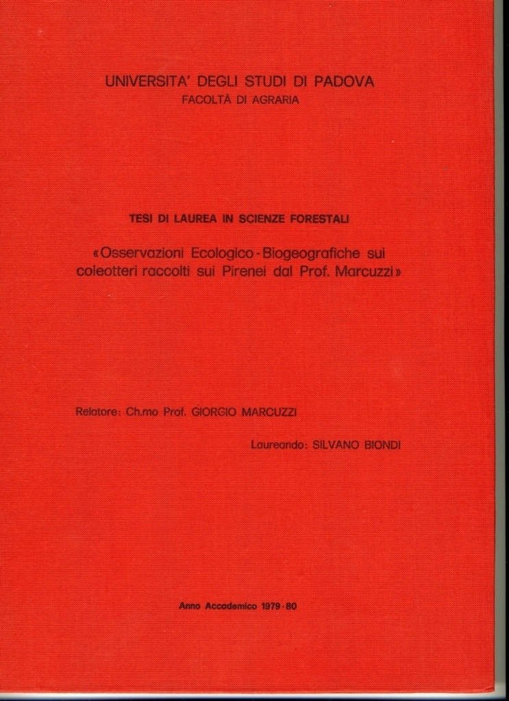 Siamo nel lontanissimo anno accademico 1979/80 e, dopo varie vicissitudini, concludo la mia carriera universitaria. Poichè mi è nata (da non moltissimi anni) la passione per i coleotteri, approdo a Ecologia animale e studio (è una parola grossa) la collezione di coleotteri raccolti qualche anno prima sui Pirenei dal Prof. Giorgio Marcuzzi. L'aspetto divertente (a posteriori) è che ero platealmente alle prime armi con i coleotteri e, soprattutto, che all'epoca non avevo mai messo piede sui Pirenei. Ciò nonostante, spedisco gli esemplari a vari specialisti per le determinazioni, ed imbastisco un discorso quasi accettabile sugli aspetti biogeografici.