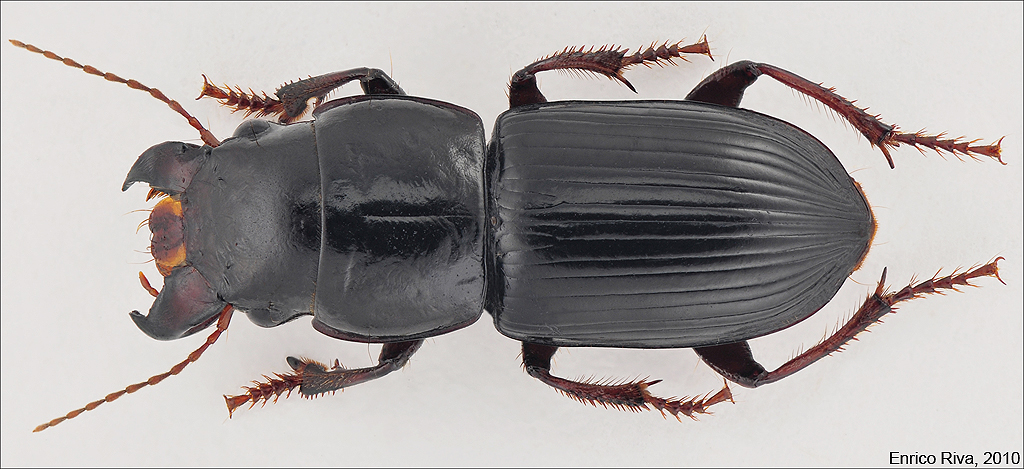 Come ha detto Gabriele il Gen è giusto, ma veniamo alla specie .Vedendo dall' ottima foto che non ha una forte incavatura nell' epistoma escluderei l' A. (O.) megacephalus. Se avesse tutte le zampe rosse sarebbe l' A. ambiguus, ma questo non mi sembra le abbia, e poi l' ambiguus ha l'incisura non proprio vicino alla base della mandibola DX. Per cui io propenderei per un comune Acinopus picipes (olivier, 1795) l'unico ad avere una forte incisura proprio alla base della mandibola DX. |