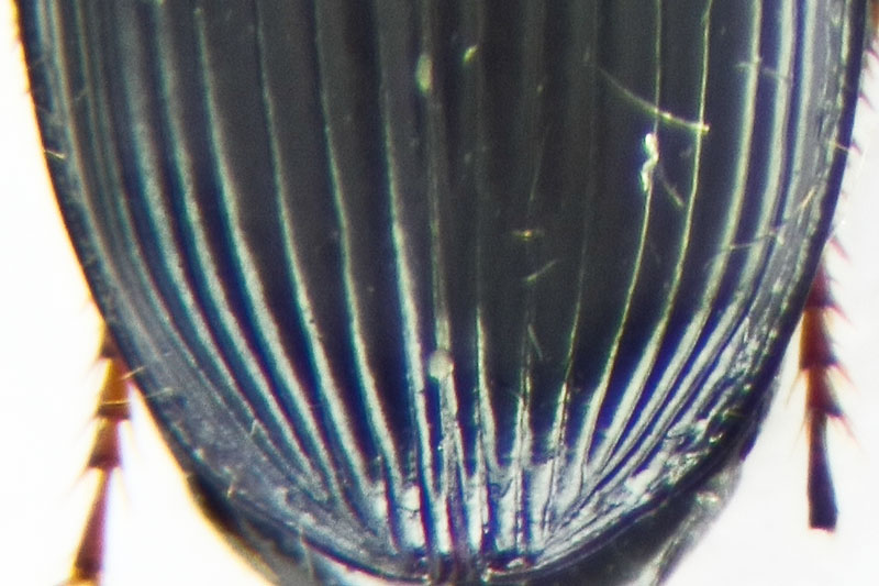 Il pronoto però risulta nettamente differente, con i lati molto sinuosi subito avanti agli angoli posteriori, questi acuti e poco arrotondati. 7a interstria elitrale, nella parte apicale, senza serie di punti.