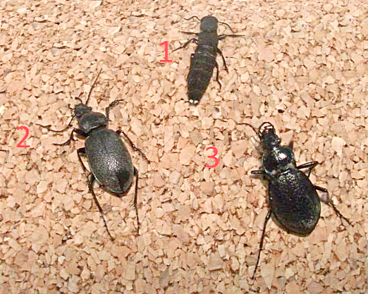 Quello della foto singola è un Carabus rossii, nella foto a tre non è che si veda molto. Mi sembrano due Carabus rossii e un Ocypus olens, ma per una determinazione sarebbe meglio inviare una foto migliore, soprattutto con gli insetti un po' più ingranditi.